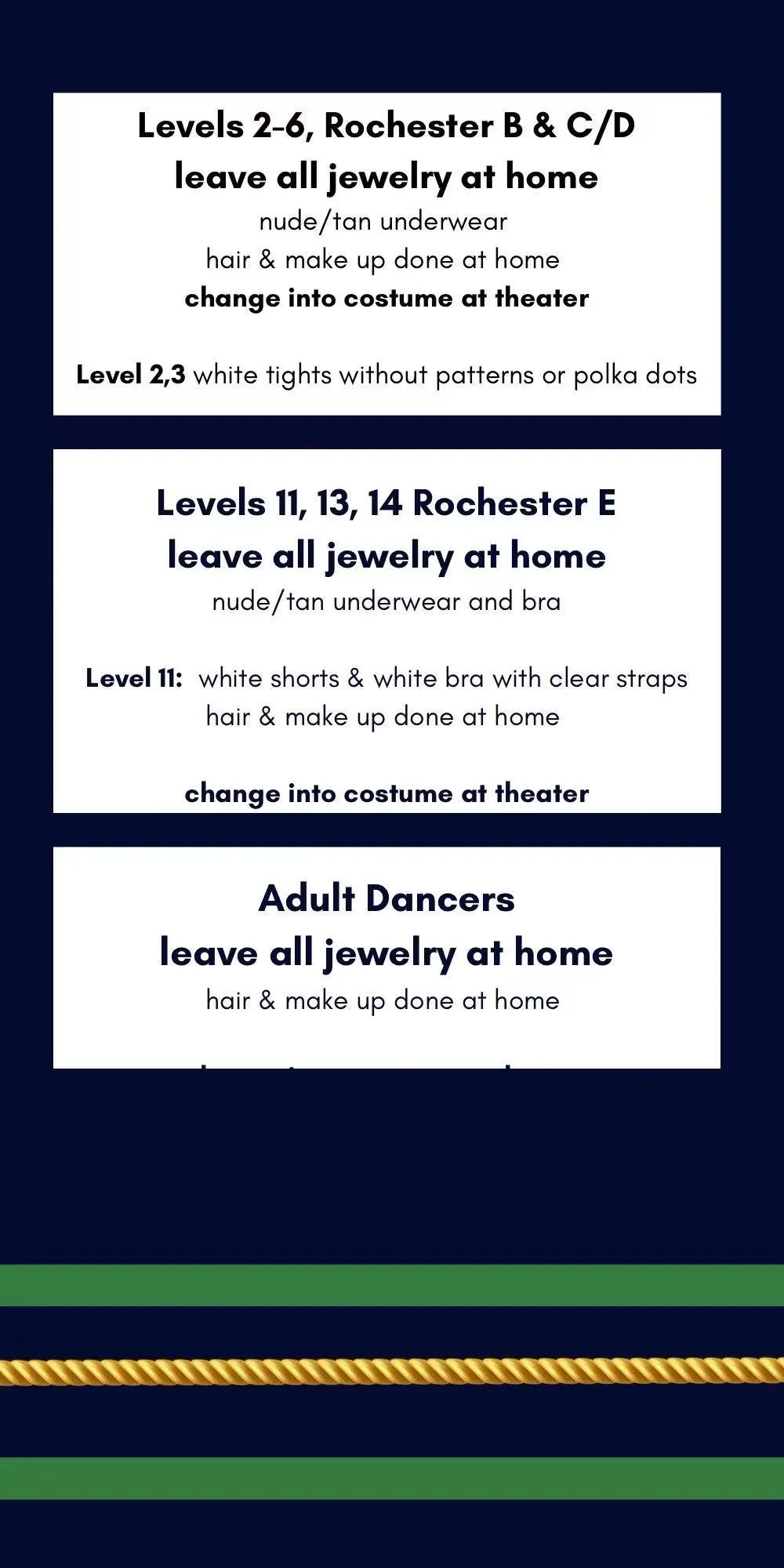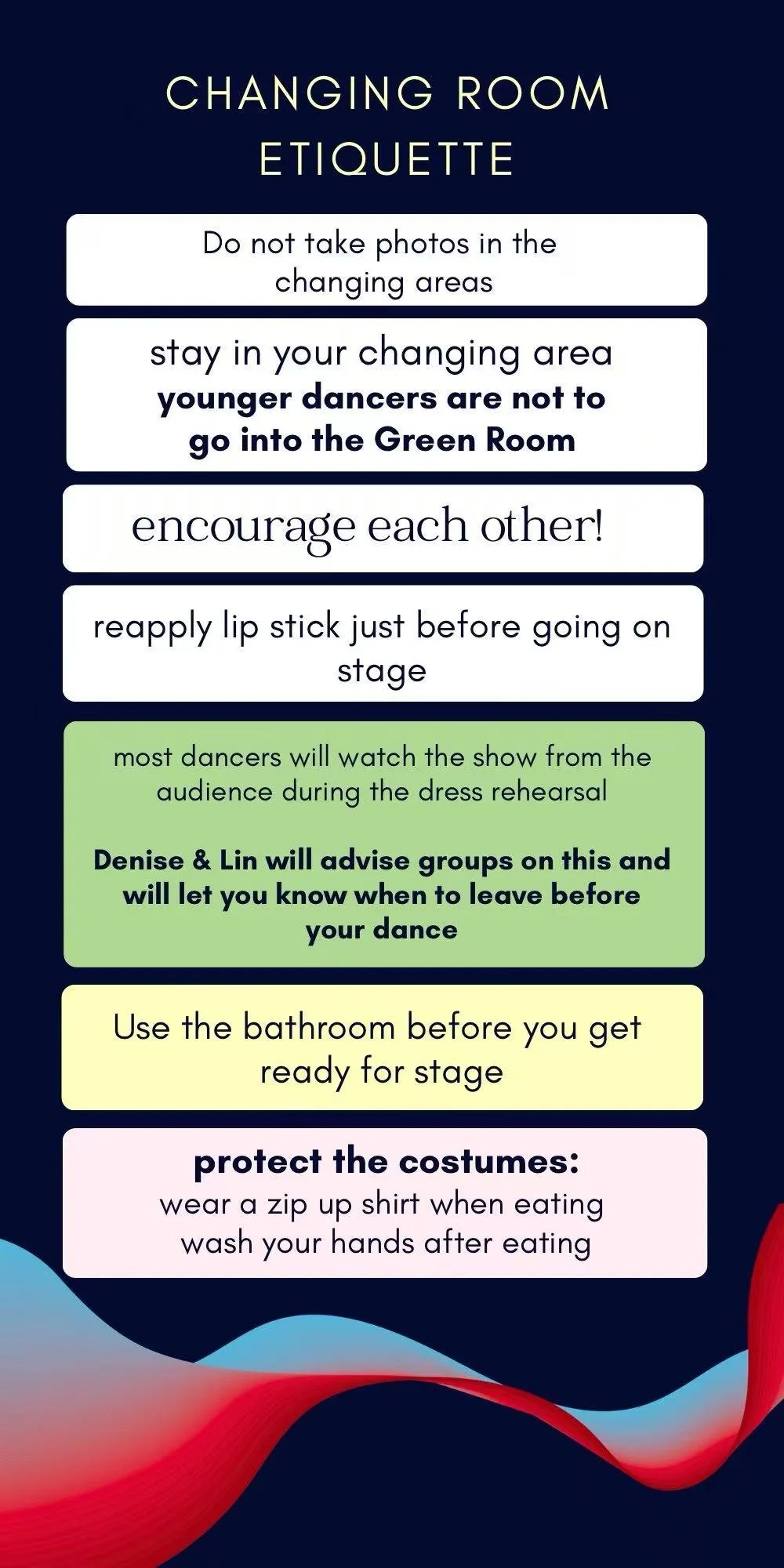 Please be mindful that the studio is not cleaned up by itself after the rehearsal so please help make the job easier by removiong everything you brought into the studio. This includes but is not limited to food, toys, costumes, bobby pins and your child.