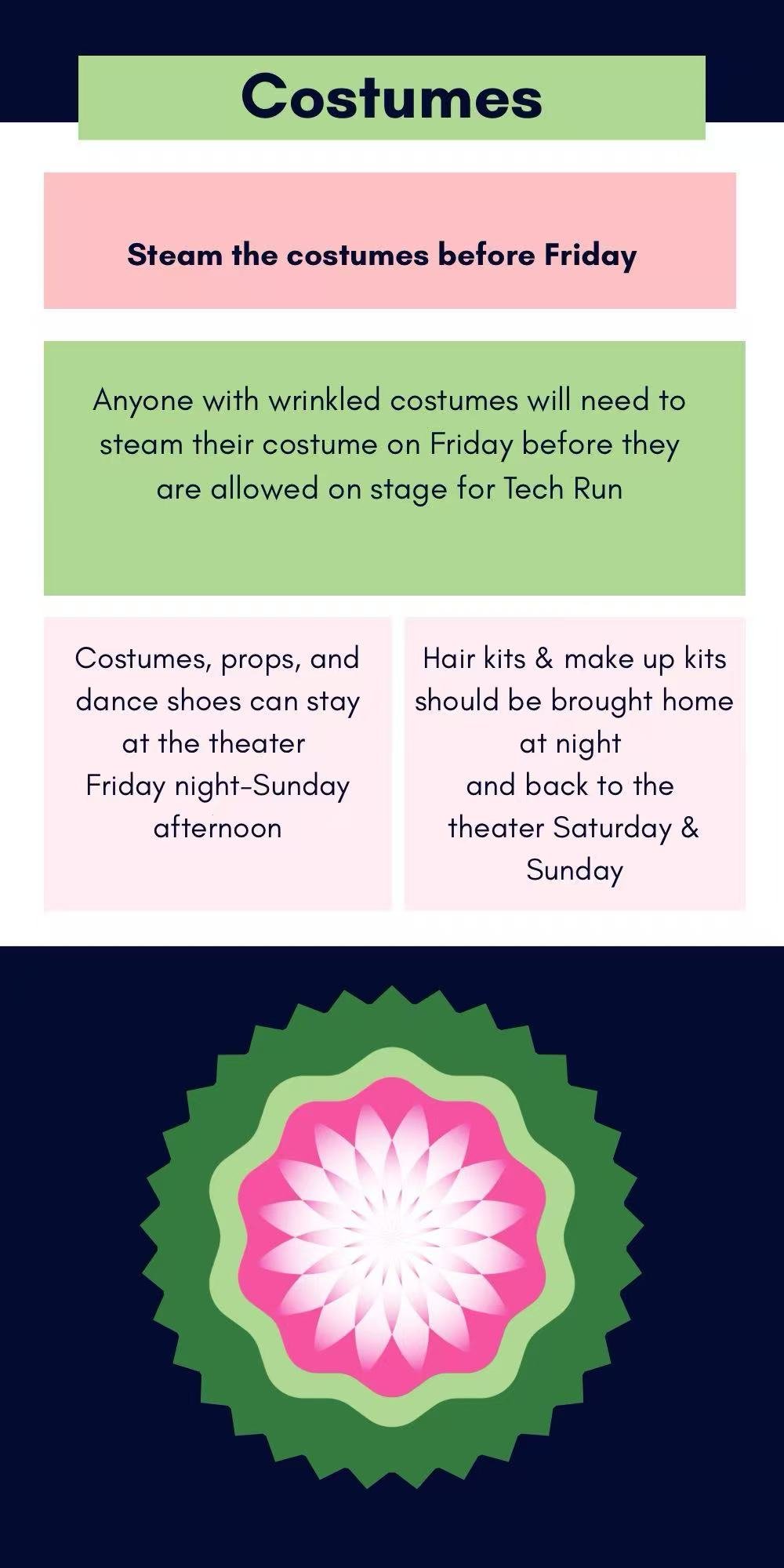 It is easy in the chaos of rehearsals to forget things so please take an extra look around and help clean up wherever you can.