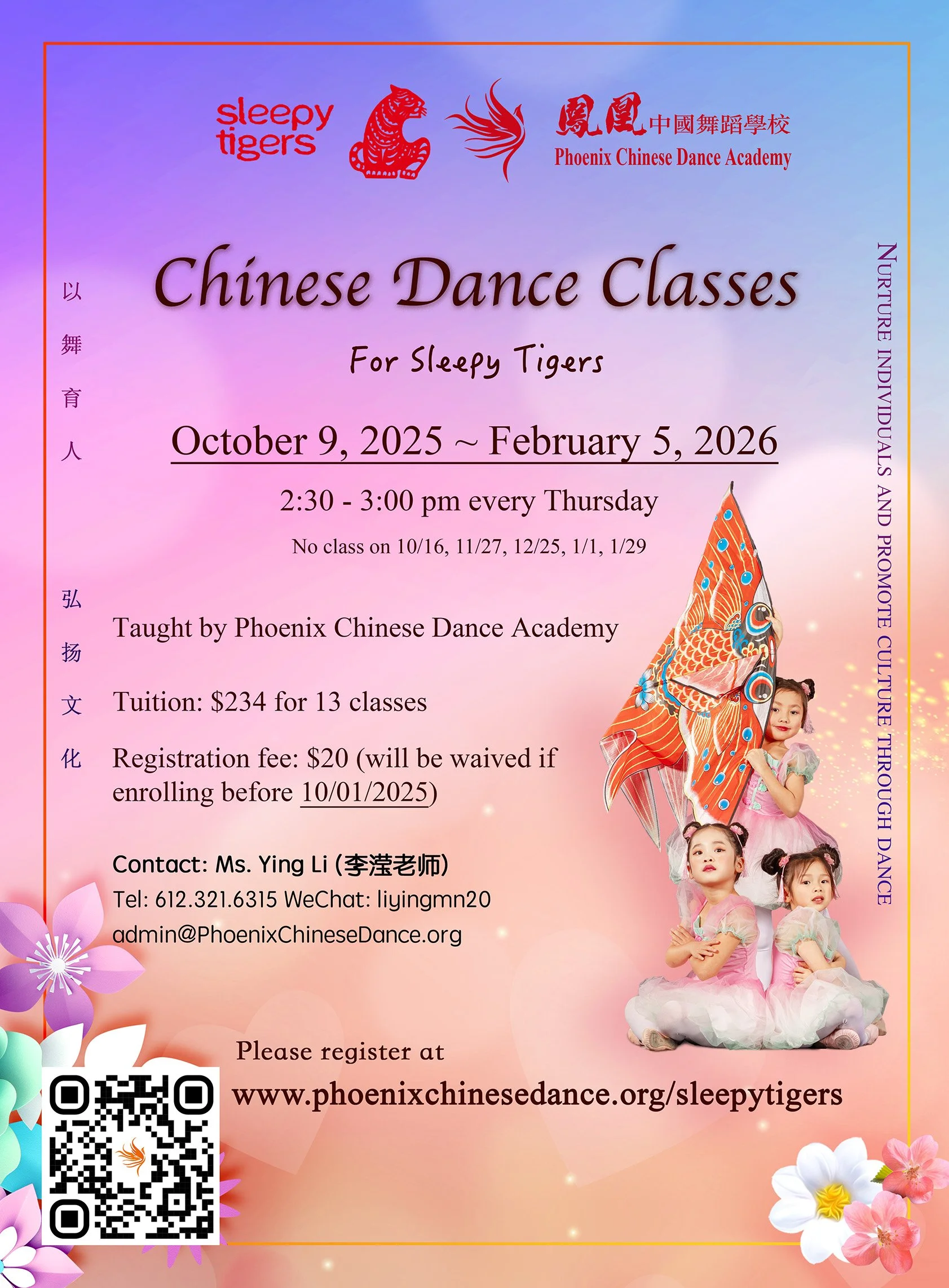 Sleepy Tigers Chinese Dance RegistrationThis class is available exclusively for students of Sleepy Tigers Chinese Immersion Preschool. Student Name * First Name Last Name Age * Parent or Guardian * First Name Last Name Email * Preferred method of payment * *A 5% processing fee will be added for credit card and paypal. Cash, Check or Zelle Credit card or Paypal* Liability Waiver * Liability Waiver: Safety is always the top priority of students in Phoenix Chinese Dance Academy. However, when attending the classes given by Phoenix Chinese Dance Academy (PCDA), you, a student of the class or the adult parent or guardian of a minor student, understand and acknowledge that you are aware of and assume the risks of serious bodily injury. You recognize your responsibility to ensure that the students participates only in those activities for which they have the required skills, qualifications, training, and physical conditioning. You understand that PCDA shall have no responsibilities to pay for medical treatment and related costs if a said student is injured. 免责申明: 凤凰中国舞蹈学校始终把学生的安全作为教学的最优先考虑。但是,当学生参加舞蹈学校的课程时,您(作为学生本人或未成年学生的监护人)知晓学生参加这样的课程仍然存在身体受伤的风险。您有责任确保学生只参与其技能和身体条件达到安全要求的活动。如果学生受伤,凤凰中国舞蹈学校不能承担由此导致的医疗费用和其它损失。 I agree Late Fee * Tuition is due in full by the first class. After that a $10 late fee will be added. I agree Refund Policy * No refunds will be given after 2 weeks of class. I agree PCDA cares about your privacy and never discloses your personal information to third parties. Questions, comments or concerns. Thank you for your registration! Your invoice will be emailed to you within 48 hours.